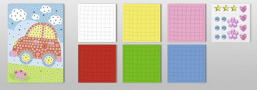 je 1x selbstklebendes Moosgummimosaik Platte in gelb, grün, rot, rosa, hellblau und weiß insgesamt 384 Mosaik Sticker
