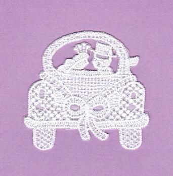 Dieser Ziersticker in weiß besteht aus einer filigranen Stickerei in Form eines Hochzeitsautos. Diese aufbügelbare Stickerei eignet sich sehr gut für die Kartengestaltung aber auch für Lampen, Keilrahmen, Filztaschen und vieles mehr. Tipp: