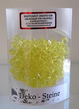 Die Acrylsteine mini in der Farbe zitronengelb sind ca. 8x14 mm groß und es befinden sich ca. 80g Inhalt in der Dekobox.
