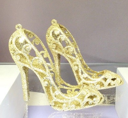 Jeder der kleinen Glitterschuh in gold haben einen Aufhänger um einen Faden durchzufädeln, daher sind die Dekoschuhe nicht nur für die Tischdeko zum hinstellen, sondern auch zum hängen an einem Türkranz oder an einer Dekogirlande geeignet.