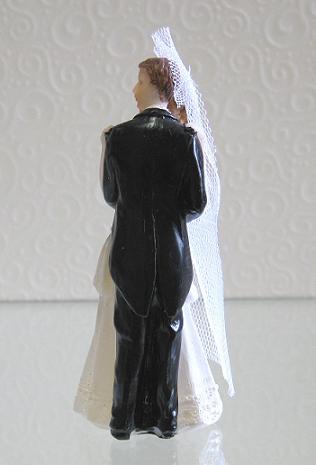 Diese kleine Hochzeitsfigur im weißen Brautkleid mit Schleier und schwarzen Anzug ist handbemalt.