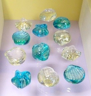 Folgende Motive befinden sich im Netz, Glasmuscheln, Glasschnecken und Glas Seesterne.