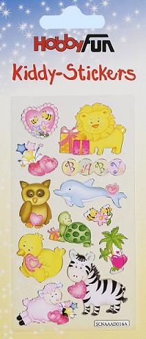 Auf diesen Kiddy Stickers in bunt befindet sich Tierkinder mit Geschenken 1x Bienen im Herz, 1x Löwe, 1x Delfin, 1x Eule, 1x Schildkröte, 1x Zebra, 1 rosa Schaf, 1x Küken, 1x Bienen mit Blumen, 1x Palme und 1 Geschenkpäckchen.