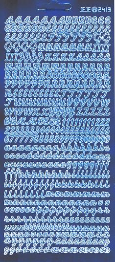 Auf diesem Reliefstickerbogen in dkl. blau Spiegelfolie befinden sich Großbuchstaben, Zahlen und Kleinbuchstaben in mini kursiv 7 mm hoch und bis 5 mm breit in folgender Anzahl:
