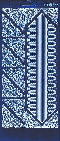 Auf diesem Reliefstickerbogen in dkl. blau befinden sich verschiedene schmale Borten, die Kanten sind abgeschrägt, und Blumenecken.