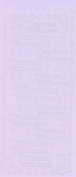 Auf diesem Reliefstickerbogen in flieder befindet sich 11x der Schriftzug Herzlichen Glückwunsch mit Herzen in verschiedenen Größen.