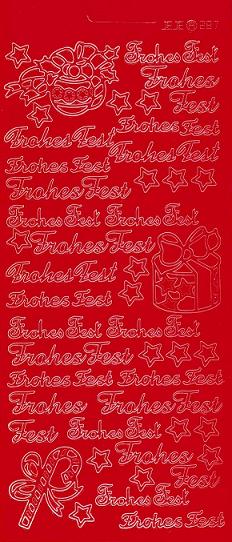 Auf diesem Reliefstickerbogen in rot befinden sich 23x der Schriftzug Frohes Fest in unterschiedlichen Schreibweisen und Größen. Beide Wörter können immer einzeln abgezogen werden.