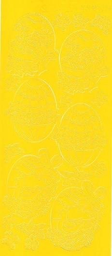 Auf diesem Reliefstickerbogen in gelb befinden sich 6 Ostereier mit Deko ca. 5 cm breit und ca. 6,5 cm hoch.