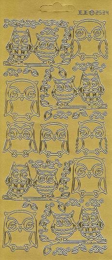 Auf diesem Reliefstickerbogen in gold befinden sich verschiedene Eulen Motive und Ornamente :