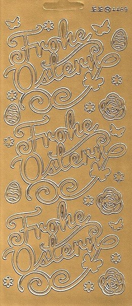 Auf diesem Reliefstickerbogen in gold befindet sich 3x der Schriftzug Frohe Ostern ca. 8,5 cm breit und ca. 7 cm hoch zusammen aufzukleben.