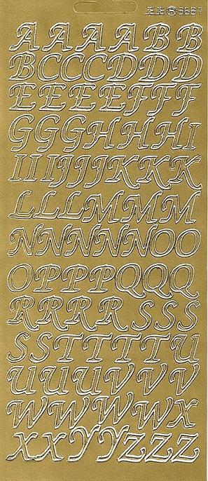 Auf diesem Reliefstickerbogen in gold befinden sich Großbuchstaben ca. 1,5 cm hoch und 0,6-1,5 cm breit in folgender Anzahl: