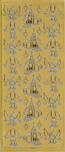 Auf diesem Reliefstickerbogen in gold befinden sich Kirchen, Tauben und Glockenpaare Diese Stickermotive eignen sich auch sehr gut als Schablone. Die Motive auf diesem Konturensticker sind glänzend gold und wirken sehr edel.