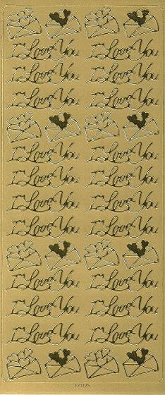 Auf diesem Reliefstickerbogen in gold befindet sich 20x der Schriftzug I Love You. In einem Schriftzug