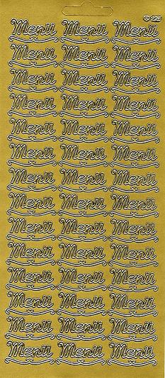 Auf diesem Reliefstickerbogen in gold befindet sich 42x der Schriftzug Menü mit separaten geschwungenen Unterstrich ca. 1 cm hoch und 2,7 cm breit.