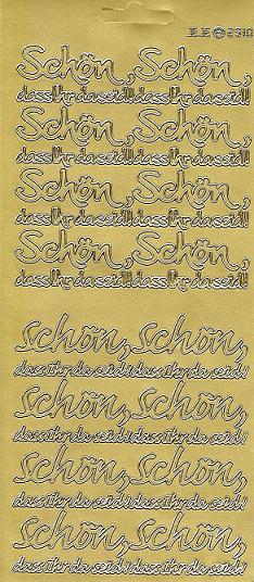 Auf diesem Reliefstickerbogen in gold befindet sich 16x der Schriftzug Schön, dass Ihr da seid !, alle Wörter können einzeln plaziert werden.