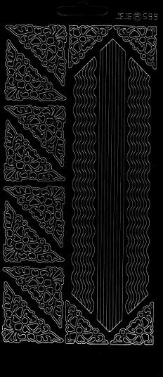Auf diesem Reliefstickerbogen in schwarz befinden sich verschiedene schmale Borten, die Kanten sind abgeschrägt, und Blumenecken.