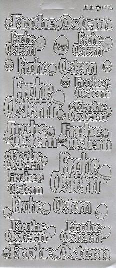 Auf diesem Reliefstickerbogen in silber befindet sich 13x der Schriftzug Frohe Ostern zusammen aufzukleben und 3x der Schriftzug Frohe Ostern getrennt aufzukleben in Blockschrift in unterschiedlichen Größen.