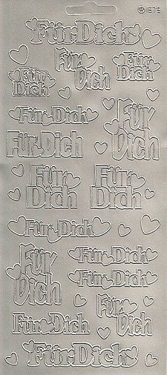 Auf diesem Reliefstickerbogen in silbe befinden sich 16x der Schriftzug Für Dich mit Herzen in unterschiedlichen Schreibweisen und Größen.