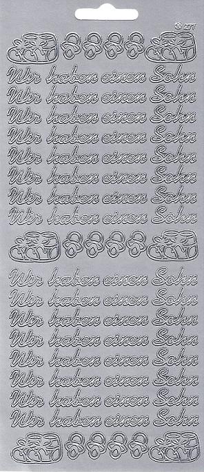 Auf diesem Reliefstickerbogen in silber befindet sich 16x der Schriftzug Wir haben einen Sohn ca. 1 cm hoch und 9 cm breit. Diese Aufkleber eignen sich für viele Basteltechniken wie z.B. Kartengestaltung, Scrapbooking und auch Kerzenbeschriftung anstelle von Verzierwachs.