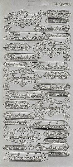 Auf diesem Reliefstickerbogen in silber befindet sich 28x der Schriftzug Handarbeit in unterschiedlichen Schreibweisen und Rahmen.