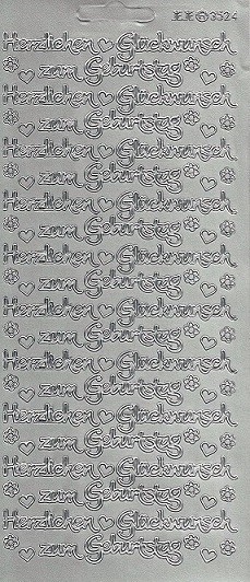 Auf diesem Reliefstickerbogen in silber befindet sich 10x der Schriftzug Herzlichen Glückwunsch zum Geburtstag.