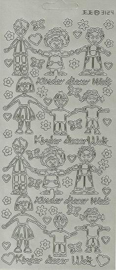 Auf diesem Reliefstickerbogen in silber befinden sich verschiedene Kinder und der Schriftzug Kinder dieser Welt. Motive und Ornamente : Diese Aufkleber eignen sich für viele Basteltechniken wie z.B. Kartengestaltung, Scrapbooking und auch Kerzenbeschriftung anstelle von Verzierwachs und auch als Schablone.