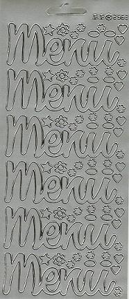 Auf diesem Reliefstickerbogen in silber befindet sich 6x der Schriftzug Menü ca. 3,2 cm hoch und 8,5 cm breit.