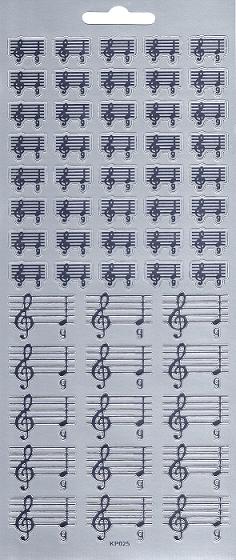 Auf diesem Reliefstickerbogen in silber befinden sich verschiedene Noten mit Notenschlüssel :