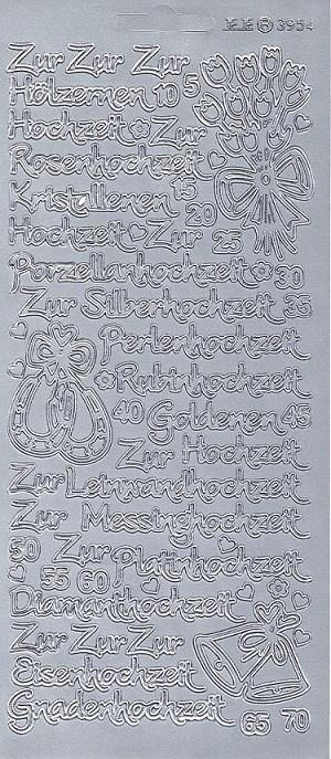 Auf diesem Reliefstickerbogen in silber befinden sich die Schriftzüge für Hochzeitsjubiläum: Diese Aufkleber eignen sich für viele Basteltechniken wie z.B. Kartengestaltung, Scrapbooking und auch Kerzenbeschriftung anstelle von Verzierwachs.