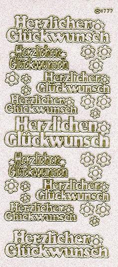 Auf diesem transparenten glitter Reliefstickerbogen in gold befindet sich 9x der Schriftzug Herzlichen Glückwunsch in unterschiedlichen Größen.