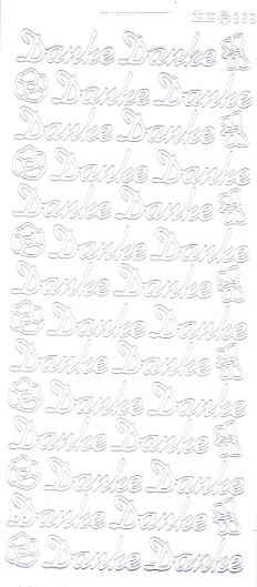 Auf diesem Reliefstickerbogen in weiss befindet sich 28x der Schriftzug Danke 1,5 cm hoch und 4 cm breit.