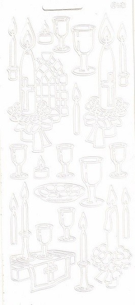 Auf diesem Konturenstickerbogen in weiss Kelche und Kerzen sind verschiedene brennende Kerzen mit und ohne Kerzenhalter, unterschiedlich große Kelche, 1x Altar mit Kelch und Kerze, 1x Altarteller und 1x Altarkerze mit Kirchenfenster einzeln zu verwenden.