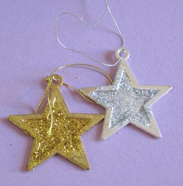 Bei diesen Sternanhängern wurde das Innenteil mit silber- oder goldglitter beklebt und sie haben eine Öse und einen dünnen Gold- oder Silberfaden zum Aufhängen.