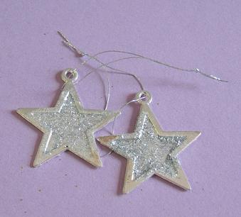 Bei diesen Sternanhängern wurde das Innenteil mit silberglitter beklebt und sie haben eine Öse und einen dünnen Silberfaden zum Aufhängen.