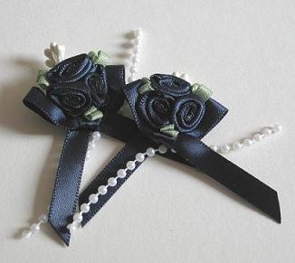 Diese kleinen Satinröschen in marine sind sehr schön geformt und mit einem kleinen grünen Satinband als Blätter eingerahmt.