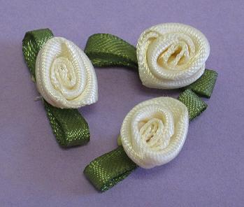 Diese kleinen Satinröschen in creme sind sehr schön geformt und die Schleife ist aus einem ca. 4 mm breiten grünem Satinband.