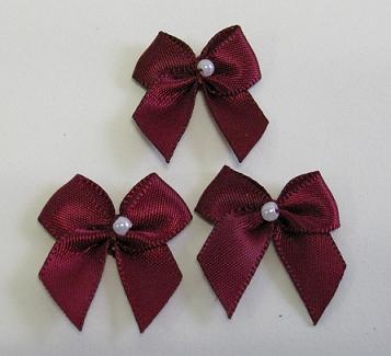 Diese kleinen Satinschleifen in weinrot sind sehr schön geformt und haben eine kleine weiße Perle in der Mitte.