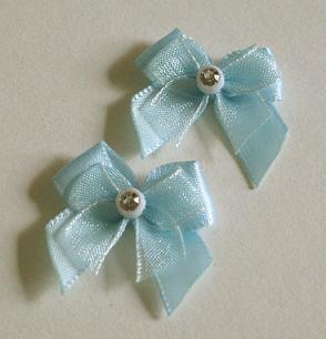 Diese kleinen Satinschleifen in hellblau sind sehr schön geformt, doppelt gelegt und haben einen kleinen klaren Strassstein in der Mitte.