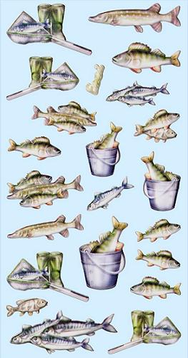Auf diesem Softy Stickerbogen in bunt befinden sich Motive aus dem Thema Angeln bestehend aus 4x Gummistifeln und Kescher, 3x Fisch im Eimer, und 14 verschiedene Fische in unterschiedlichen Größen einzeln zu verwenden.