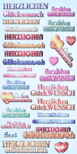 Auf diesem Softy Stickerbogen in bunt sind 18x Herzlichen Glückwunsch in unterschiedlichen Größen und Schreibweisen, selbstklebend vorhanden.