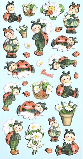 Auf diesem Softy Stickerbogen in bunt sind Motive Lustige Marienkäfer bestehend aus 13 verschiedene Marienkäfer, 2 Blumentöpfe, 2 Blumenkörbe, 7 kleine Marienkäfer, und diverse Blüten in unterschiedlichen Größen einzeln zu verwenden.