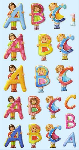 Auf diesem Softy Stickerbogen ABC Mädchen in bunt sind folgende Motive in unterschiedlichen Größen selbstklebend vorhanden: