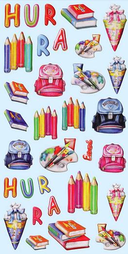 Auf diesem Softy Stickerbogen in bunt sind Motive für die Schule bestehend aus 2x Schrift HURRA, 5 verschiedene Bücherstapel, 4 Buntstifte, 4 Malpaletten mit Pinsel, 4x Schultüten und 4 Rucksäcke in unterschiedlichen Größen einzeln zu verwenden.