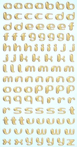Auf diesem Softy Stickerbogen in gold sind selbstklebende Kleinbuchstaben 7-10 mm hoch und 5-10 mm breit in folgender Anzahl: