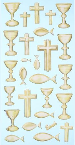 Auf diesem Softy Stickerbogen in gold sind Motive für die Kommunion und Konfirmation bestehend aus 7x Kreuze, 10x Kelche und 9x Fische in verschiedenen Größen, einzeln zu verwenden.
