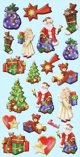 Auf diesem Softy Stickerbogen in bunt sind Motive für die Lustige Weihnacht bestehend aus 2 Geschenksäckchen, 2 Weihnachtssterne, 2 Nikolausstrümpfe, 2 Engel mit Geschenken, 2x Nikolaus mit Geschenksack, 2x Geschenkpakete, 2 geschmückte Weihnachtsbäume, 2x Teddybärchen mit Geschenkpaket und 2x rote Herzen mit Stern in unterschiedlichen Größen einzeln zu verwenden.
