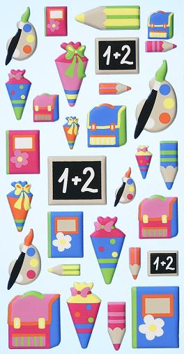 Auf diesem Softy Stickerbogen sind Motive für die Schule und Einschulung bestehend aus 3x Tafel, 5x Schulranzen, 4x Malpalette, 4x Hefte, 7x Buntstifte und 7x Zuckertüten in unterschiedlichen Größen einzeln zu verwenden.