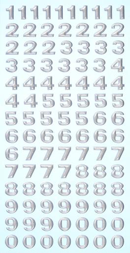 Auf diesem Softy Stickerbogen in silber sind selbstklebende Zahlen 10 mm hoch und 7-10 mm breit.