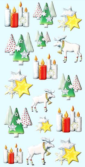 Auf diesem Softy Stickerbogen in bunt sind Motive für die Weihnachtszeit bestehend aus 4x Adventskerzen, 4 Weihnachtssterne, 5 Weihnachtstannen, und 3x rote Elche mit Glöckchen in unterschiedlichen Größen einzeln zu verwenden.