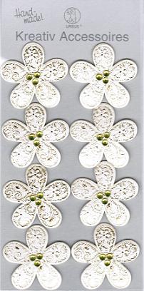 Die Blüten sind aus geprägten Goldkarton und mit Spiegelfolie veredelt zusätzlich sind drei kleine goldgelbe Kristallsteinchen in der Mitte.
